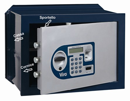 - Butées anti-défoncement. Pour garantir la plus haute résistance au défoncement, la porte, outre qu’elle doit être robuste, doit reposer sur des butées anti-défoncement présentes à l’intérieur du coffre-fort, entre le cadre et la caisse. Conjointement aux charnières, ce sont elles qui absorbent principalement les coups. Les butées doivent être présentes sur tous les côtés à l’exception du côté des charnières qui, comme on l’a vu plus haut, doit de préférence être en contre-dépouille. Elles doivent être de grandes dimensions et épaisses, non obtenues par simple pliage de la tôle du corps, et doivent être unies à la caisse par une solide soudure continue.